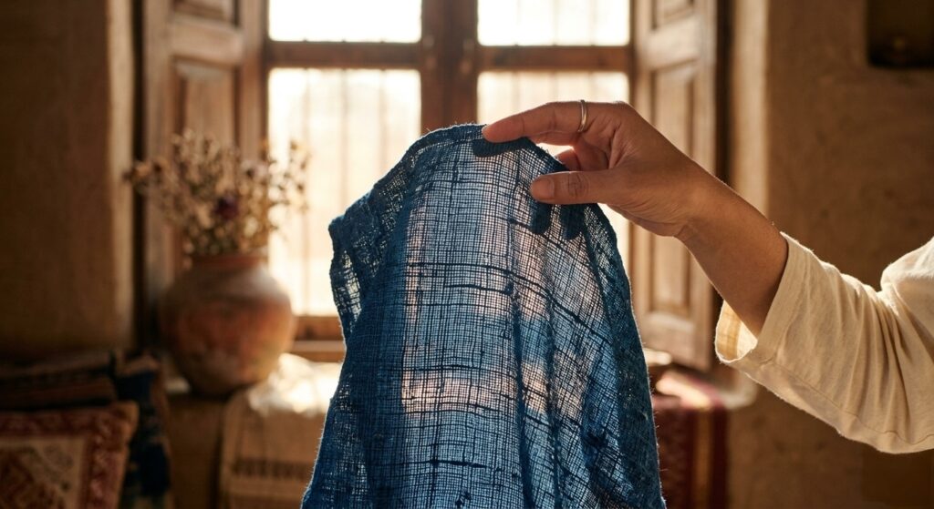 When examining a garment, hold it up to a natural light source. If the light filters through in a perfectly repeating grid, it is likely a machine weave. On the other hand, handloom will show a beautiful, slightly irregular “sieve” effect.